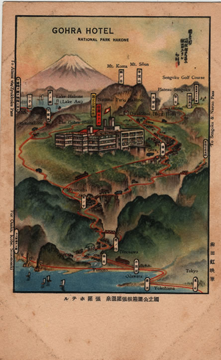 | 十指を屈する吉田初三郎画伯の弟子達(金子常光氏、中田富仙氏は除く)の中で、一番の高弟である前田虹映(本名は穣)は、明治30年山口県柳井市の生まれ。21歳になった大正7年春、上京して当時風景画の重鎮として時めいていた田中頼璋氏の門下生になり、画壇でも注目されていたのであったが、ふとした機会から鳥瞰名所図絵の世界で大活躍の初三郎の主張と画風に心服し、ついには大正10年、24歳の時に初三郎の門を叩いて認められる。 その翌年には、初三郎に協力して、『秩父ながとろ遊園地図絵』(第1作)を出版。この年には、初三郎の経営する大正名所図絵社(観光社の前身)に参加していた小山吉三氏、金子常光氏は小山氏の弟・中田富仙(甚吉)氏を連れて退社し、日本名所図絵社をおこしているので、より一層、師を助けて名所図絵の完成に力を傾注してきた画伯であり、絵師であった。初三郎工房としてのプロダクション的要素があいまって、数多くの作品が誕生した昭和初期、特に昭和4年は108点以上の作品群があり、驚異的ではある。この頃の画室は、前田虹映、名川朝太郎氏、その他画室にいる数名の画生達によって運ばれてゆくのでありますが、勿論吉田先生も画室にいる間は其の側につききりで絶えず其処此処のと訂正の画筆を揮われるのであります。前田虹映は弟子達の中心的存在として、師の深い信頼を集めていたのであった。 |
