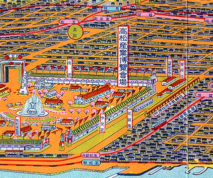 高松市で開催された産業博覧会に合わせて発行された金子常光作の観光鳥瞰図。博覧会場と周辺の市街地が全体の三分の一を占め、瀬戸内海の島々や周辺の山々などは必要最小限に描かれている。高松市の鳥瞰図は山側より眺めたものが多い中、同時期に同じ構図で描かれた「高松屋島名所図絵」とともに瀬戸内海側より鳥瞰した構図となっている。対岸の岡山側からの距離がとても近く感じるなど工夫の跡が観られ興味深い。 | ||||||||||||||||